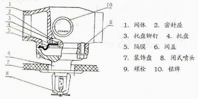 本閥系統(tǒng)隔膜式結(jié)構(gòu),由隔膜將閥分為工作腔與控制腔。水流(壓力0.1~1.2Mpa)作用于工作腔的同時(shí),亦從引水孔進(jìn)入控制腔而作用于隔膜上(與感溫噴頭通),由于隔膜上下受水作用面積的差異保證了閥瓣的密封性能。